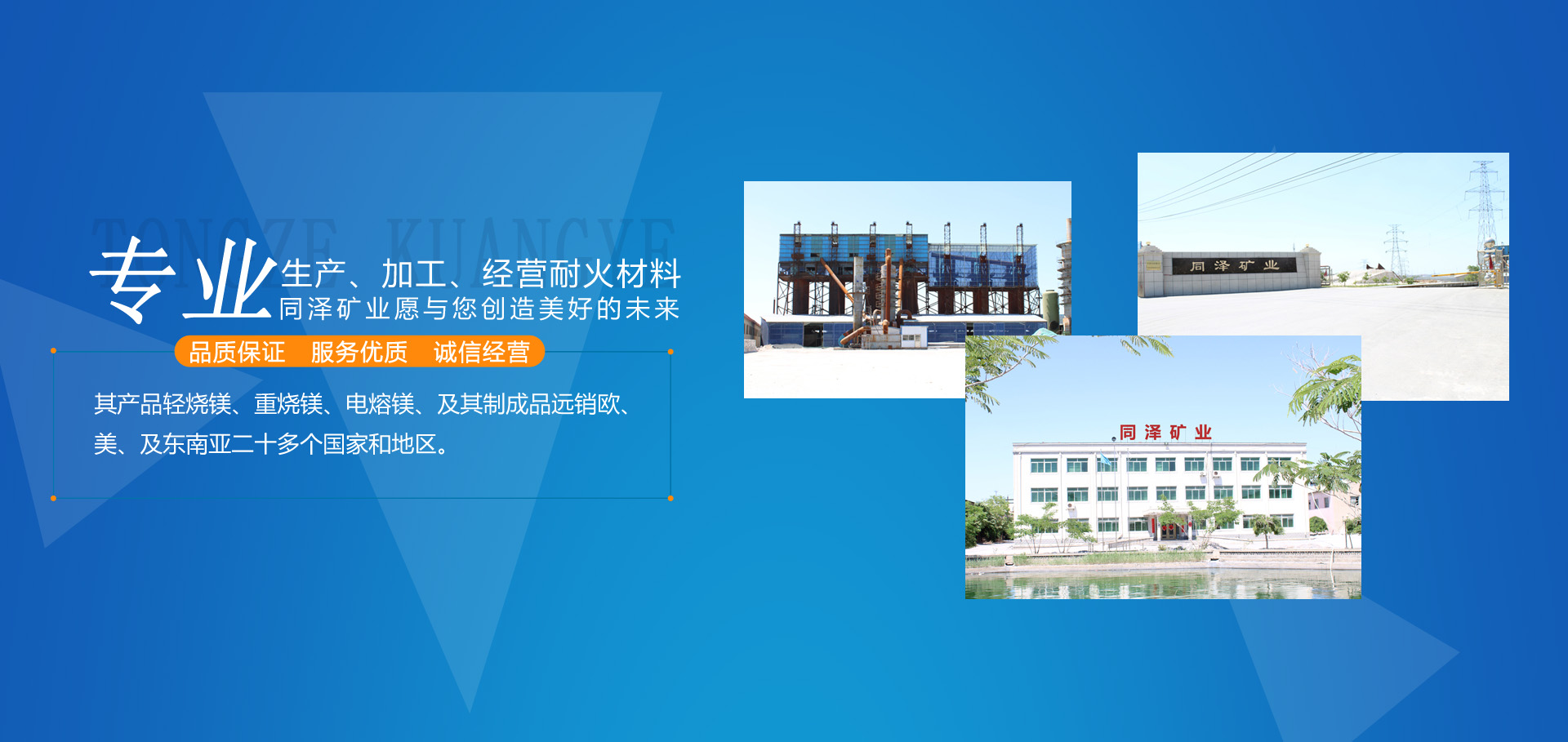 大石橋市同澤礦業(yè)有限公司,是以生產(chǎn)、加工、經(jīng)營(yíng)各種耐火材料為主的綜合性經(jīng)濟(jì)實(shí)體。其產(chǎn)品輕燒鎂、重?zé)V、電熔鎂、及其制成品遠(yuǎn)銷歐、美、及東南亞二十多個(gè)國(guó)家和地區(qū)。